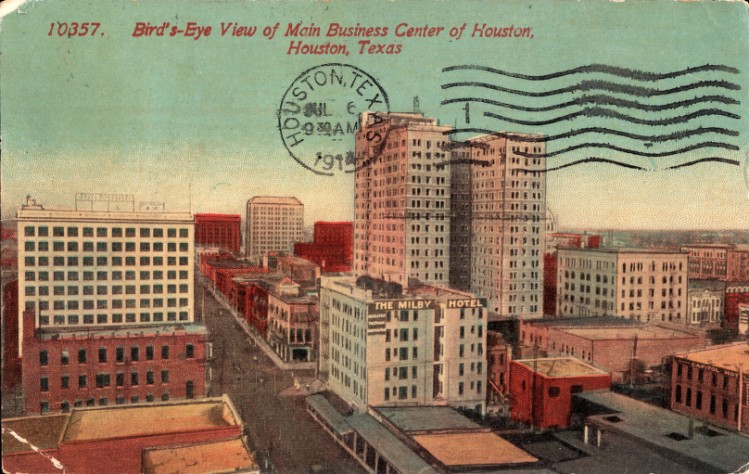 On another corner once stood the Chronicle Building, home to the Houston Chronicle. The ten-story tower was often called the “finest newspaper building in the South.” The Milby Hotel stood on the NW corner of Travis and Texas in the 600 block of Travis. The Milby made way for downtown Houston development and was demolished in 1971. The rest of the block on the east side of Travis was taken up by the Montgomery Ward building. Wards was across the street from the Iris Theater on Travis and across the street from the Rice Hotel on Texas.