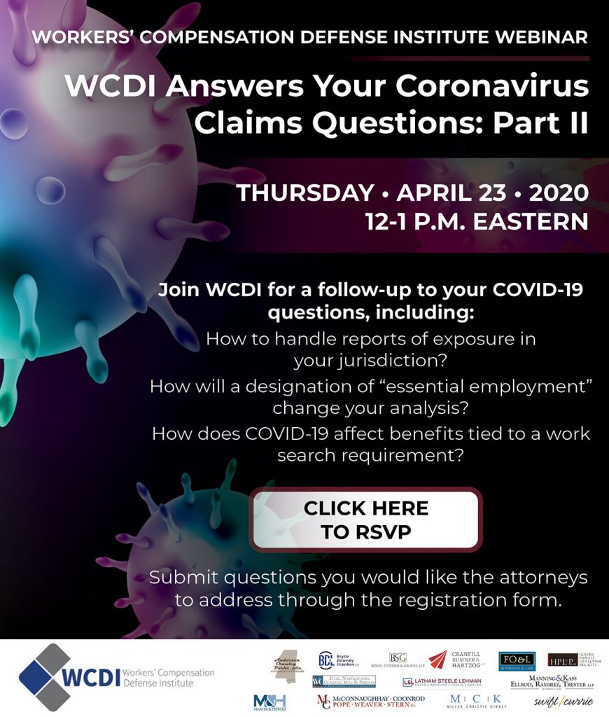 Please join Bobby Stokes for Workers’ Compensation Institute’s “WCDI Answers Your Coronavirus Questions: Part II” webinar on April 23, 2020 at 11:00 a.m. CST (12:00 EST) presented via Zoom. The webinar will answer many of the industry’s looming follow-up questions related to this global pandemic.