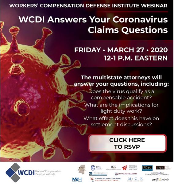 Join Steve Tipton Friday, March 27, 2020, in a one-hour live-streamed multi-state discussion designed to answer your Coronavirus claims questions. The online presentation, sponsored by the Workers’ Compensation Defense Institute, will include expert analysis of the implications of the pandemic on the workers’ compensation systems of the following WCDI-member jurisdictions: Texas, Illinois, Florida, Georgia, Oklahoma, Louisiana, Mississippi, Kentucky, Tennessee, Alabama, South Carolina, North Carolina, and California.